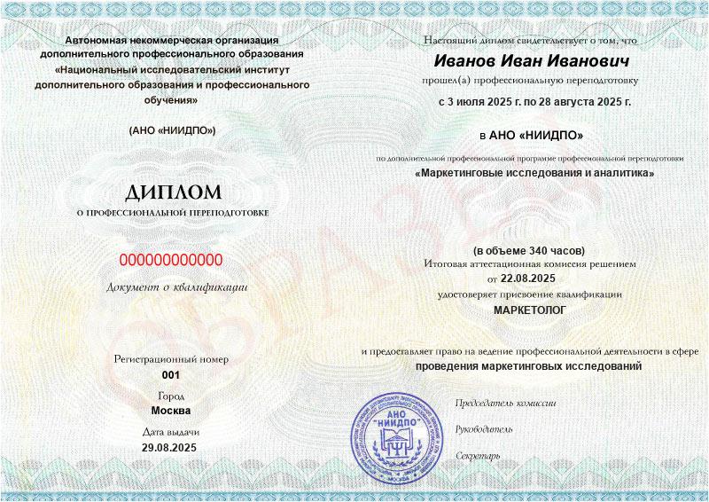 - Диплом с присвоением квалификации маркетолога по программе дополнительного профессионального образования «Маркетинговые исследования и аналитика»