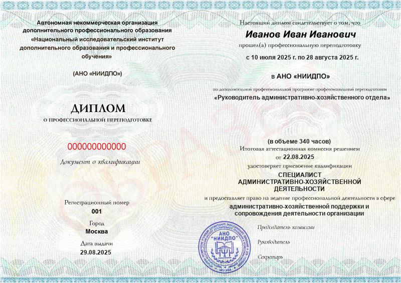 - Квалификация: Специалист административно-хозяйственной деятельности