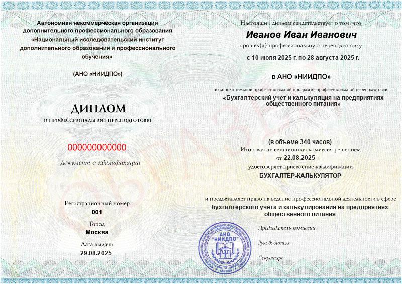 • Диплом с присвоением квалификации бухгалтера-калькулятора по программе дополнительного профессионального образования «Бухгалтерский учет и калькуляция на предприятиях общественного питания»
