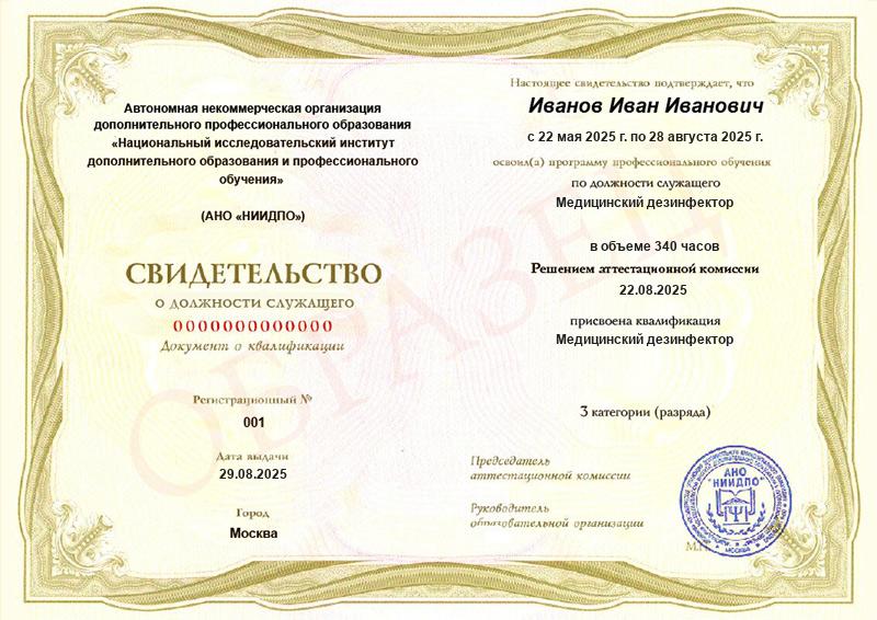 Медицинский дезинфектор относится к представителям среднего медперсонала. При этом специалисту не нужно профильное образование — достаточно получить знания на специальных курсах для работы по профессии, в том числе в дистанционном формате.