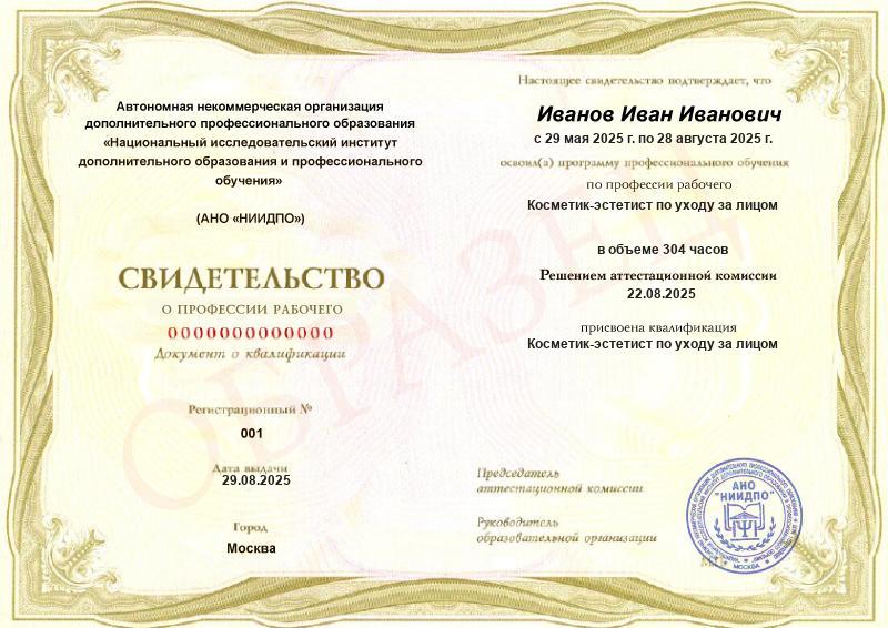 - Квалификация: Косметик-эстетист по уходу за лицом