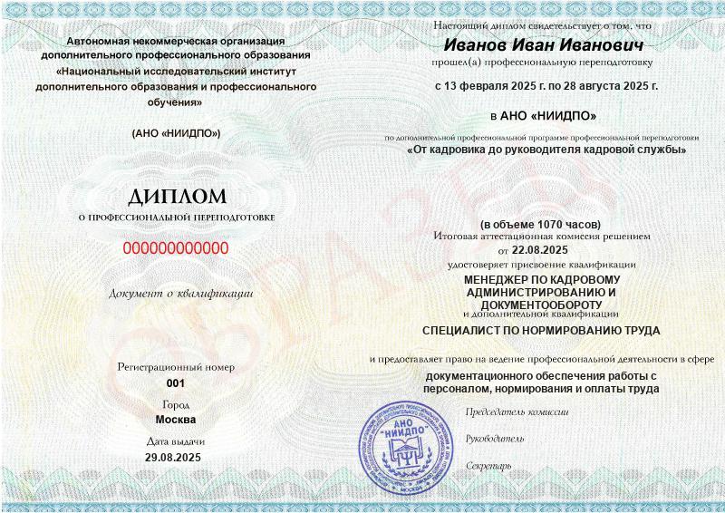 - 2 квалификации: Менеджер по кадровому администрированию и документообороту + Специалист по нормированию труда