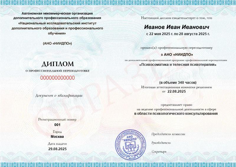 Студент, желающий поступить в АНО «НИИДПО», должен предоставить справку из образовательной организации. Независимо от срока окончания обучения по программе дополнительного образования, диплом о профпереподготовке выдаётся только после предъявления документа о получении среднего профессионального или высшего образования.