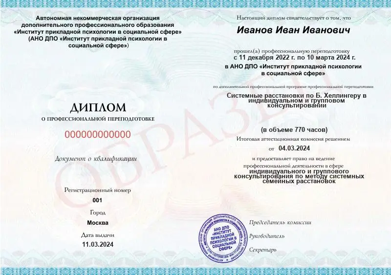 • Диплом о профессиональной переподготовке с правом на ведение профессиональной деятельности
