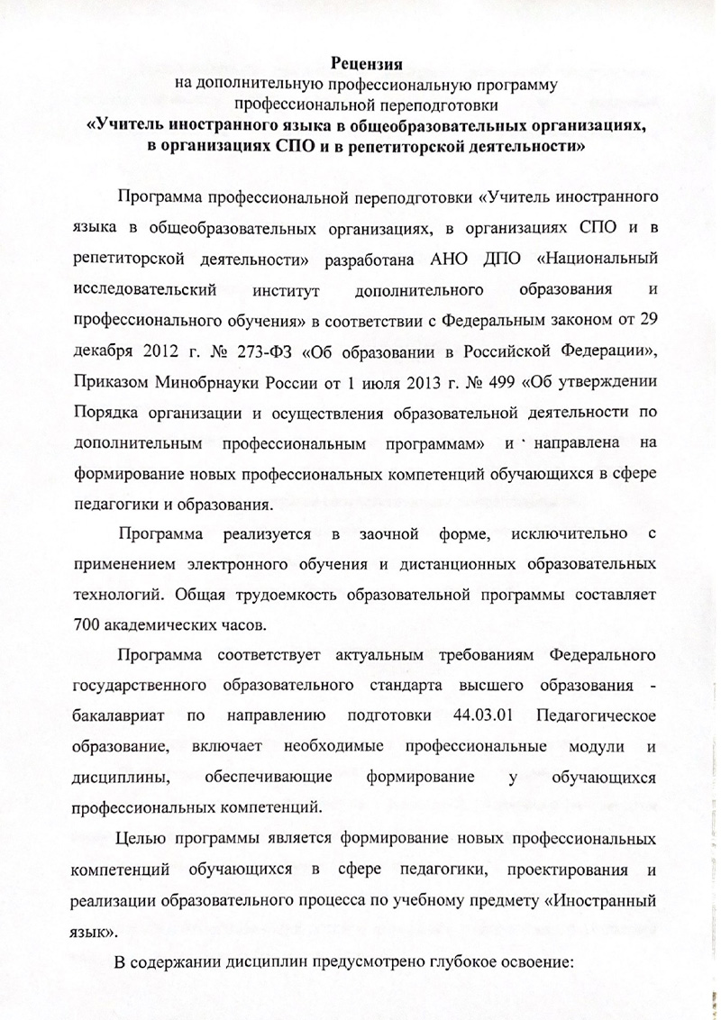 Я прошла курс Учитель иностранного языка в НИИДПО и хочу поделиться своими впечатлениями. Обучение было очень насыщенным и полезным. Программа курса охватывает все ключевые аспекты преподавания иностранного языка: от методик обучения до психологических особенностей работы с учениками разного возраста. Преподаватели института - настоящие профессионалы своего дела. Материалы курса были структурированы и поданы в доступной форме, что позволило легко усваивать информацию. Особенно хочется отметить практическую направленность курса: много внимания уделялось разработке уроков, использованию современных технологий в обучении и подготовке к реальным ситуациям в классе. Онлайн-формат обучения был очень удобен. Все материалы доступны в любое время, а обратная связь от преподавателей оперативная и конструктивная. По окончании курса я получила не только новые знания и навыки, но и официальный документ, который подтверждает мою квалификацию. Это очень важно для дальнейшего трудоустройства и профессионального роста. Рекомендую НИИДПО и этот курс всем, кто хочет повысить свою квалификацию в области преподавания иностранных языков.