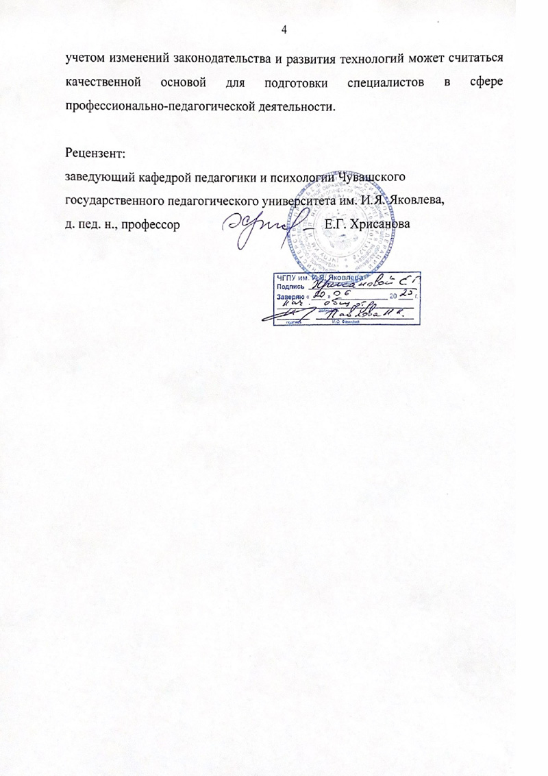 Читайте рецензию заведующего кафедрой педагогики и психологии ФГБОУ ВО «Чувашский государственный педагогический университет им. И.Я. Яковлева», доктора педагогических наук, профессора Хрисановой Е.Г.