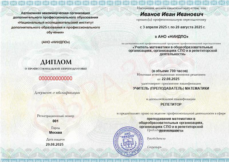 - 2 квалификации: Учитель (преподаватель) математики + Репетитор